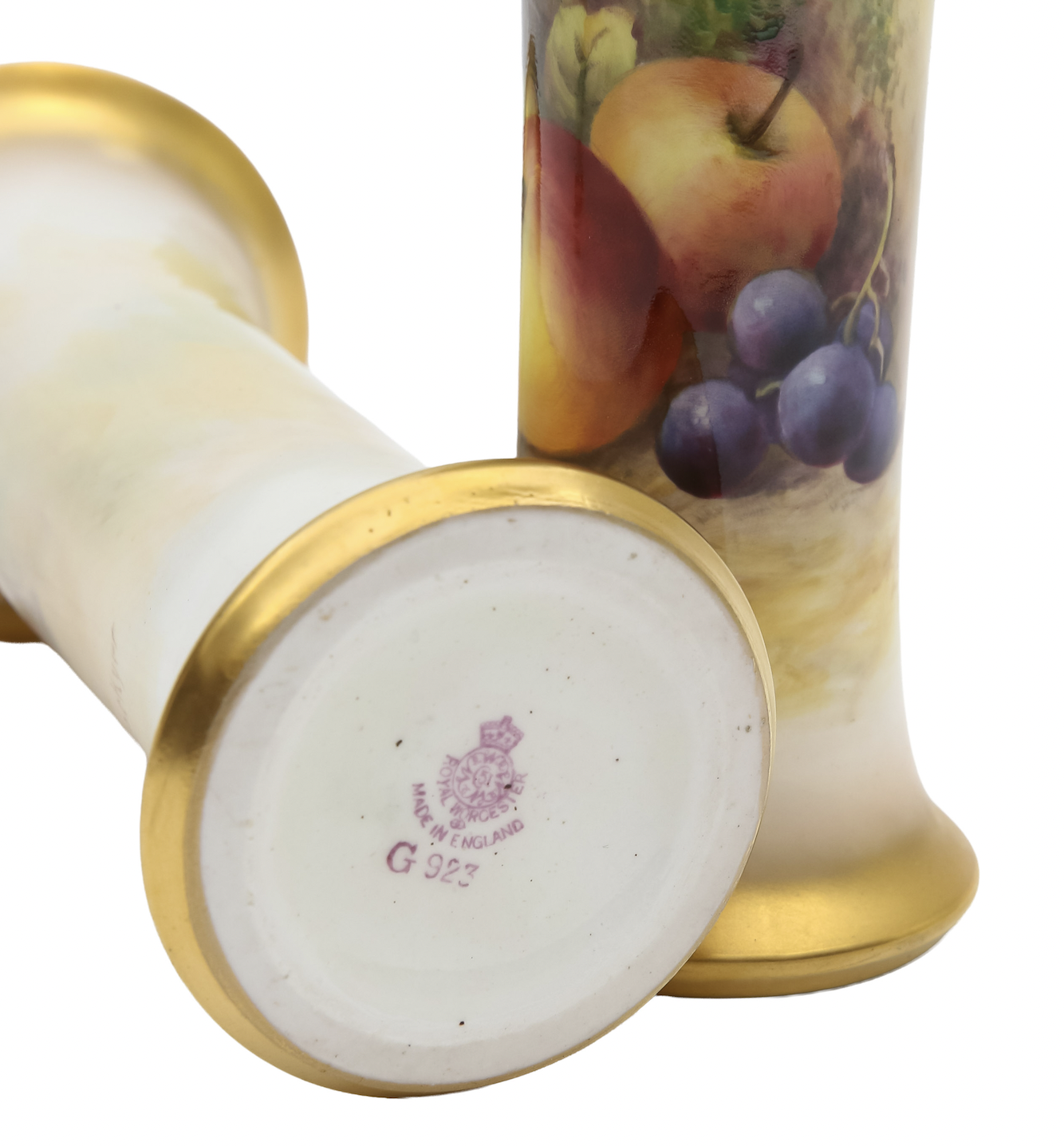 The first is the backstamp. Although you cannot rely on maker’s marks to authenticate, genuine Royal Worcester pieces have a crown mark and ‘51’ in the centre (marking the company’s establishment in 1751). There are various iterations of the mark, which help to indicate age. After 1867, the company also used date codes, which allow us to ascertain the year of manufacture. Lot 284, a pair of vases, was stamped with a 1931 date code and sold for £260.