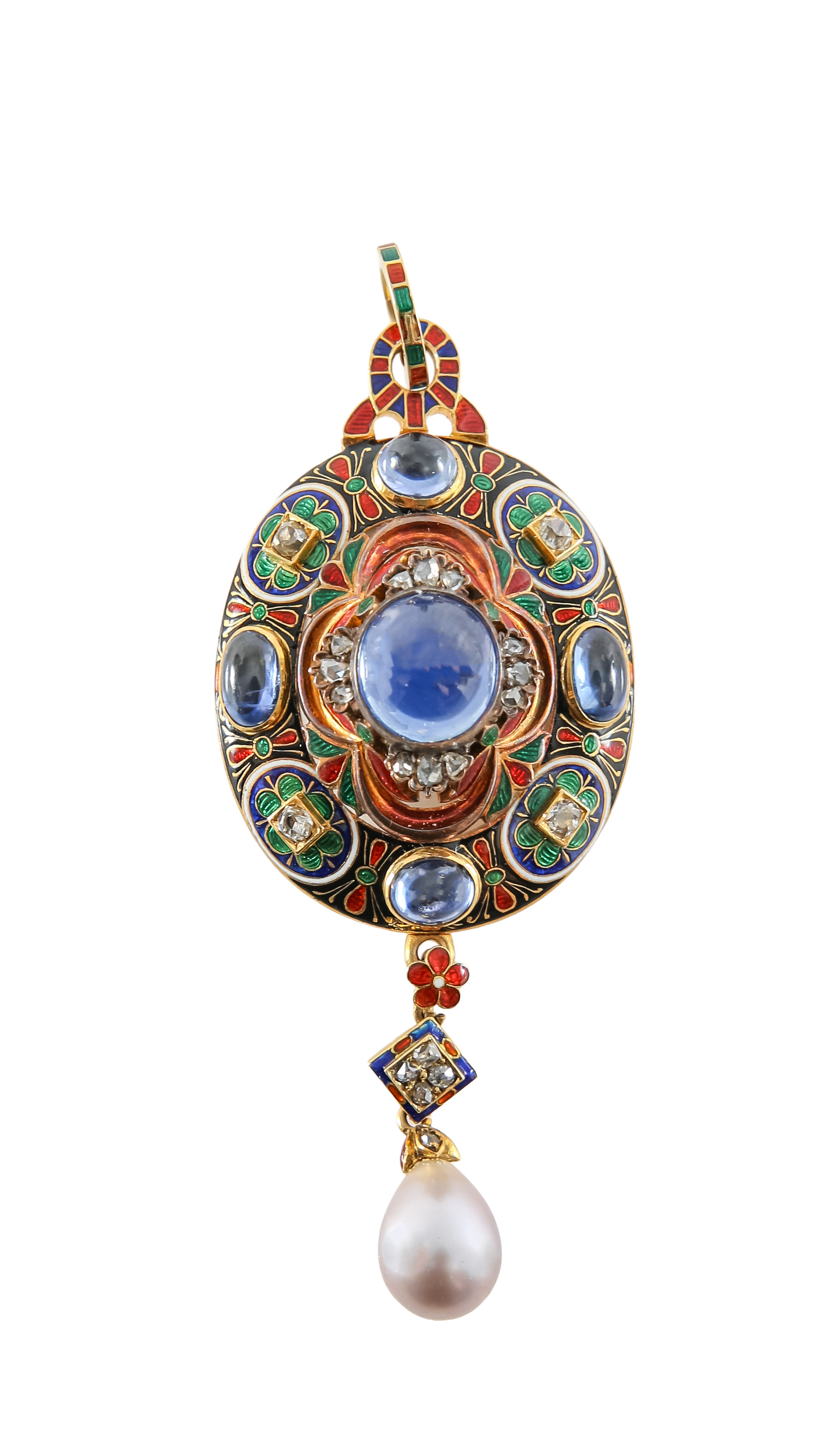 Lot 192 - a mid-Victorian gem-set, pearl and enamel Holbeinesque pendant